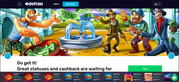 При входженні на казино Фонтан розташування елементів орієнтоване на негайну реєстрацію та вхід до акаунта. Верхня частина сторінки містить логотип, меню мов та основні кнопки входу. Центральна область зайнята слайдером з актуальними промоакціями та банерами нових релізів.